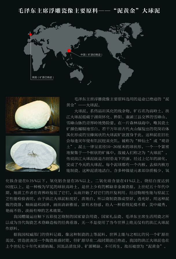 大球泥是偉晶巖風(fēng)化物,雪白球狀體,形似恐龍蛋;含鋁量極高,含鐵量極少,是制作陶瓷的稀缺原料。至今世界只發(fā)現(xiàn)兩個(gè)礦源,一個(gè)是英國(guó),二戰(zhàn)時(shí)枯竭;一個(gè)是湖南雪峰山,上世紀(jì)八十年代枯竭。現(xiàn)存于世就一百多 噸,絕大部分被大球泥瓷藝公司搶救性保護(hù)收藏,并審慎研究、開發(fā)、利用。
