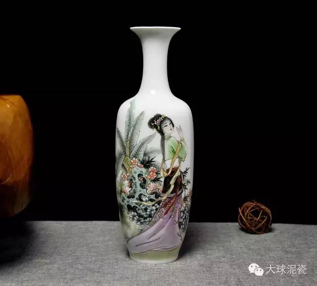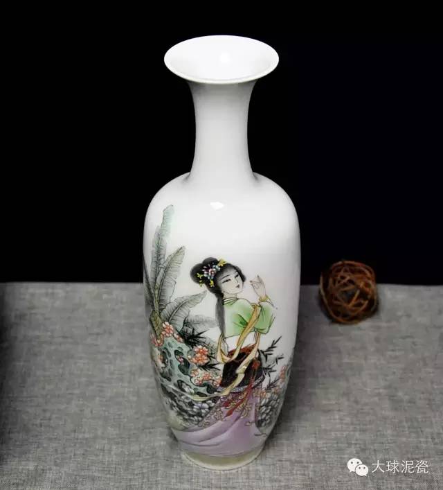 《如花似玉》柳葉瓶,以大球泥為主要材料,經1400°C高溫燒制而成。其瓶型設計精美、畫面端莊大方、瓷質致密不漏,是珍貴的陶瓷藝術品!度缁ㄋ朴瘛妨~瓶,由高級工藝美術大師曾亞琴創作,器型撇口,短頸,豐肩,肩下削瘦至足,足內凹。瓶身挺拔秀美,通體素凈,雍容中不失典雅,其氣韻之美,代表了大球泥瓷的制瓷技藝。