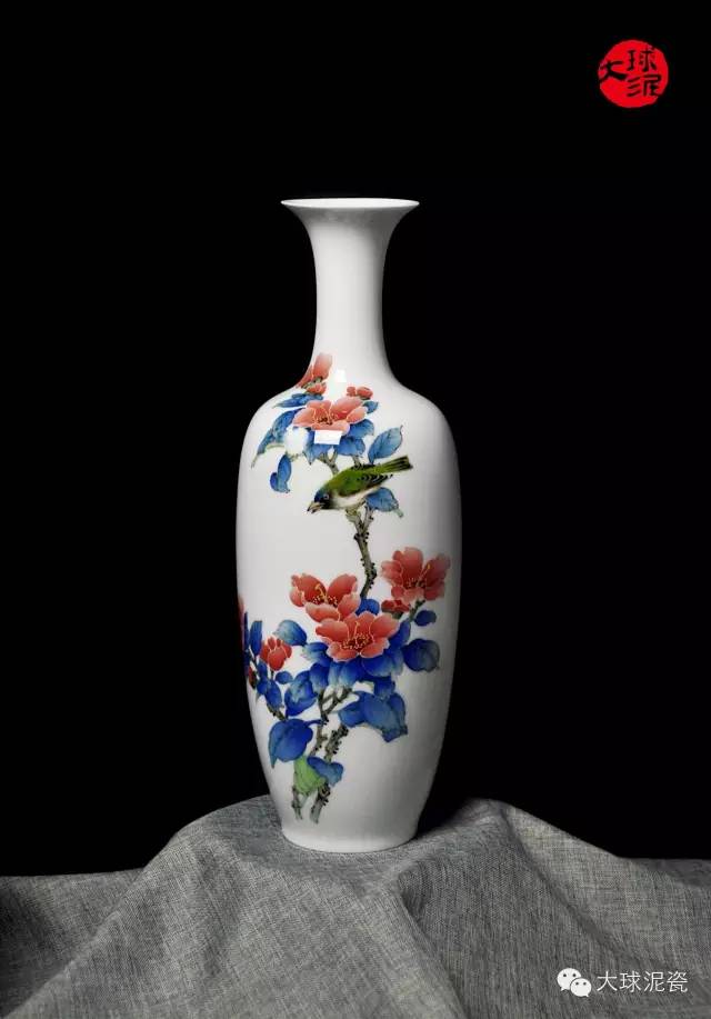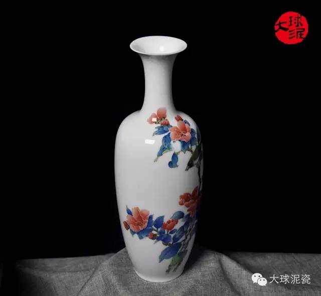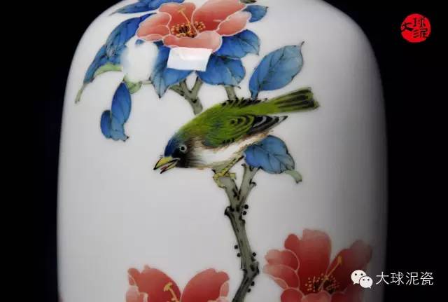 《鳥語花香》柳葉瓶,以大球泥為原材料,由工藝美術(shù)大師李璜香創(chuàng)作。釉色光亮純凈,潔白泛青,畫面典雅清新,極具中國傳統(tǒng)手繪之神韻。此件大球泥瓷,采用國畫中常見的花鳥題材進行創(chuàng)作,畫面布局疏密有致,有動有靜,筆墨韻味更勝于紙質(zhì)畫作,體現(xiàn)出作者深厚的繪瓷功底。