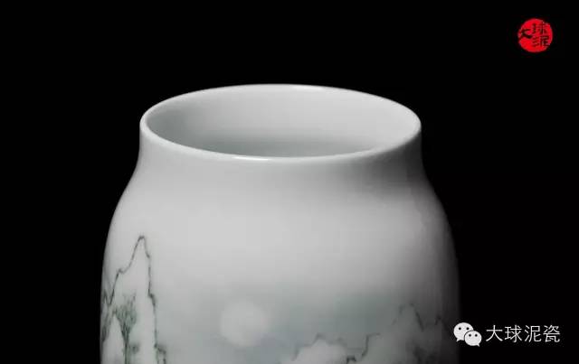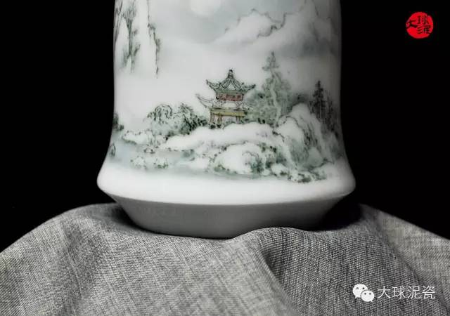 水墨國畫與大球泥瓷的完美融合,工筆重彩隨著畫面的延伸而流動、轉變,使得畫面有著虛無縹緲的美麗,有著詩情畫意的朦朧,讓觀賞者的心靈從塵世間得以解脫,得以愉悅。細細欣賞著《風花雪月》收口瓶,仿佛我們置身于高山原野,飄蕩在岸邊的烏船上,休憩山間樹林中的涼亭里,在霧氣繚繞的山水間,隨波逐流。而頭頂上的太陽隨時會沖破云層與迷霧,光芒萬丈,使人心生希望與向往。“此景只應天上有”,這正是《風花雪月》收口瓶的魅力之處,讓人舍棄塵埃,心想著一場與“風花雪月”有關的故事。