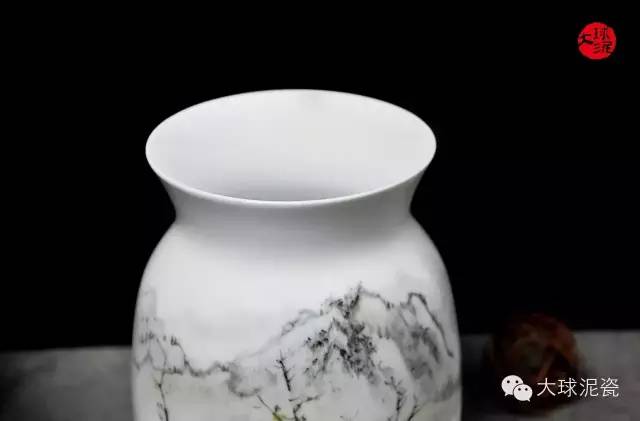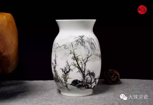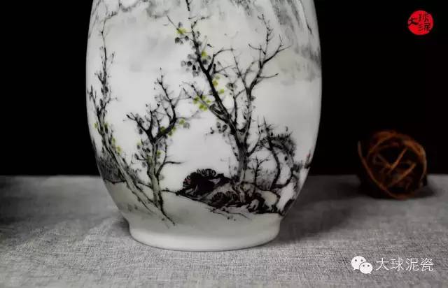 《江南春早》瓶,構圖開闊,氣勢磅礴,韻律和諧,經過高溫燒制而成的大球泥瓷更是潔白無瑕,晶瑩剔透,呈現出飽和富麗的色彩。