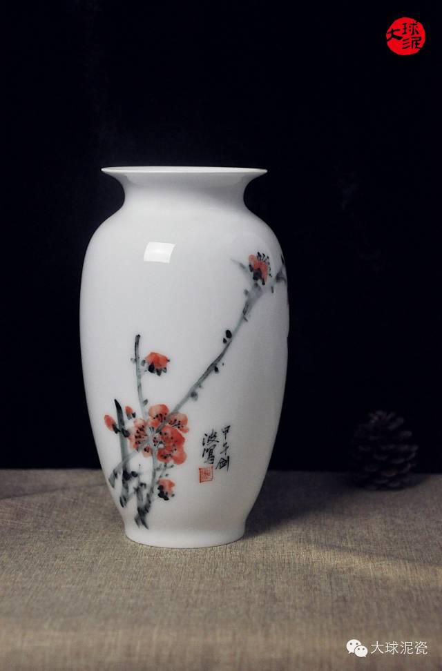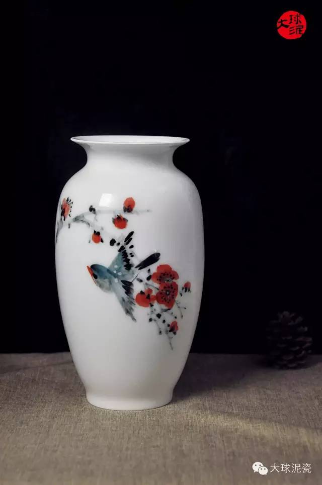 瓶身渾圓飽滿,彰顯大氣穩重,器型流暢自然,簡潔中飽含一番韻味。《鐵骨含香》藕瓶以大球泥為原料,以梅花裝飾為題材。瓶身上繪制著一株梅花寒風盛開,梅枝細勁挺健,勃勃向上;梅花填色厚實,傲然綻放,姿態萬千;雀鳥撲枝展翅,盈鬧枝頭,艷麗嬌俏。整幅畫面清雅大氣,釉里紅點染的紅梅,嬌艷火紅,深深的吸引著觀賞者的目光。 梅,古往今來被視為高風亮節的楷模,其堅強、高雅的品性為人所樂道。一件典雅的藝術品傳達給人們的精神內涵是無可限量的,收藏《鐵骨含香》藕瓶,給人視覺上的情感體驗,心靈的沖擊與震撼。在觀賞藝術的同時,還能獲得靈感啟迪與生活感悟,可謂是大球泥瓷的精品之作。