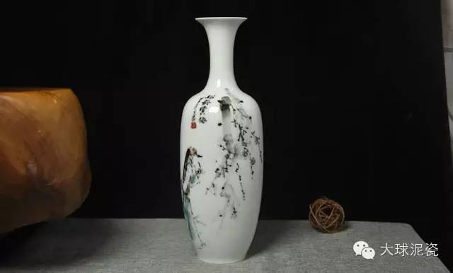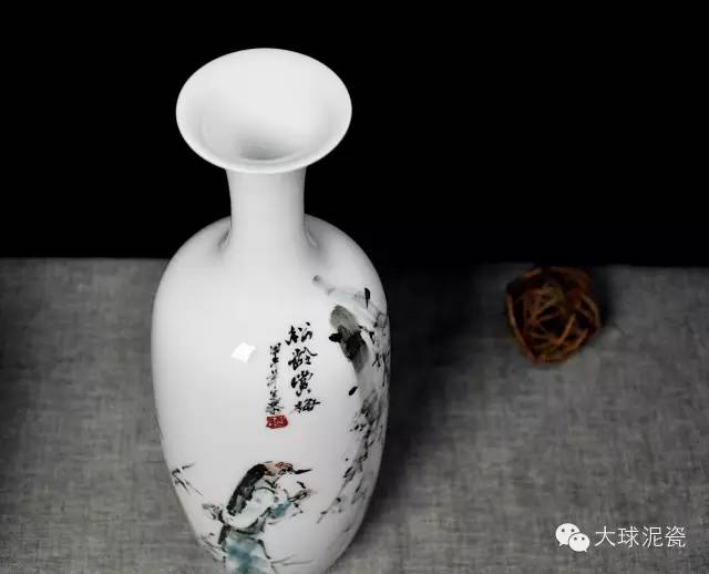 寒冬臘月,天寒地凍,大雪紛飛,天地間唯有梅花傲骨錚錚,凌寒獨(dú)放。也許是窗外的這一樹梅花盛放得太熱烈太激昂,引得屋內(nèi)的聊齋先生——蒲松齡毅然放下手中的筆墨,走到梅樹下抬頭凝望。梅花與他一樣,都是豐富的,卻又都是孤獨(dú)的。梅花的品格縱是千古以來的文人墨客都無法吟誦得淋漓盡致,而聊齋先生的八斗才氣、滿腔熱血在科舉制度的框架下也無法盡情施展。面對(duì)此情此景,紛飛的思緒里或有對(duì)剛才伏案所作文章的靈機(jī)一動(dòng),更多的應(yīng)該是對(duì)自身命運(yùn)不濟(jì)、懷才不遇的深思。《松齡賞梅》瓶便是中國(guó)陶瓷藝術(shù)大師閻先恭先生以此畫面為靈感,所創(chuàng)作出的大球泥瓷珍品。