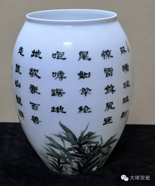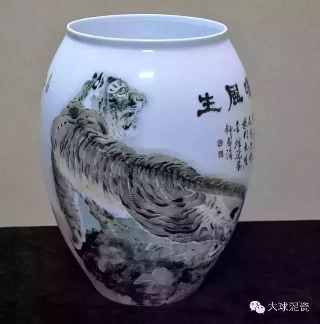 《虎嘯風生》瓶由國家級工藝美術大師鐘喬清先生和著名畫家陳久云先生共同創作于2007年。口部碩大,象征著虎氣吞山河的氣勢,自腹部向下逐漸內收,端莊穩重,整個器型顯得豐滿圓潤,十分大氣。畫面以猛虎、山石為主,幾支竹葉傲然而立。色澤深淺搭配和諧,用墨嫻熟到位,彰顯一種深遠層次感。一目觀全景,壯闊之至。對猛虎的描繪極為細膩,顯示出強烈的質感,細微處絨毛亦形象逼真,觀之恍若活物一般,宛若能聽到其巨大的吼叫聲,如雷貫耳。