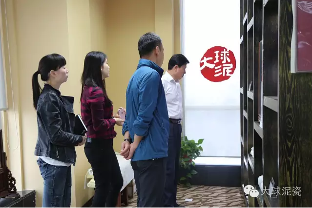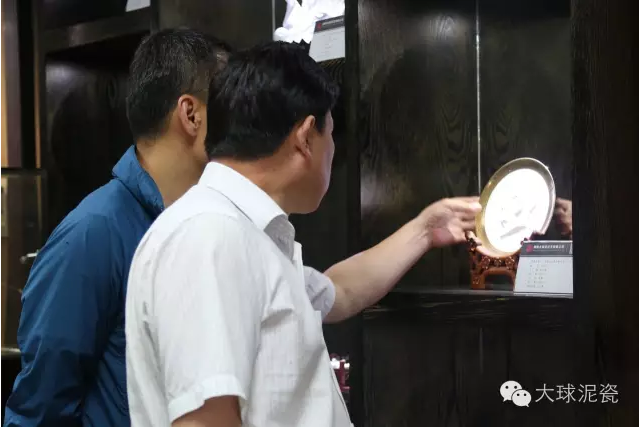 在公司工作人員陪同下,甘處長一行首先參觀了大球泥瓷精品展示廳,并詢問了大球泥原料的形成、發現、存量及大球泥瓷的特點,對于大球泥瓷經典作品做了仔細鑒賞。他建議,這么珍貴的作品,每一件都要做好版權登記,取得保護,防止別人來仿冒、假冒大球泥作品。