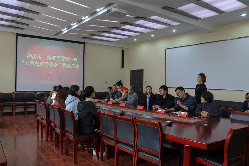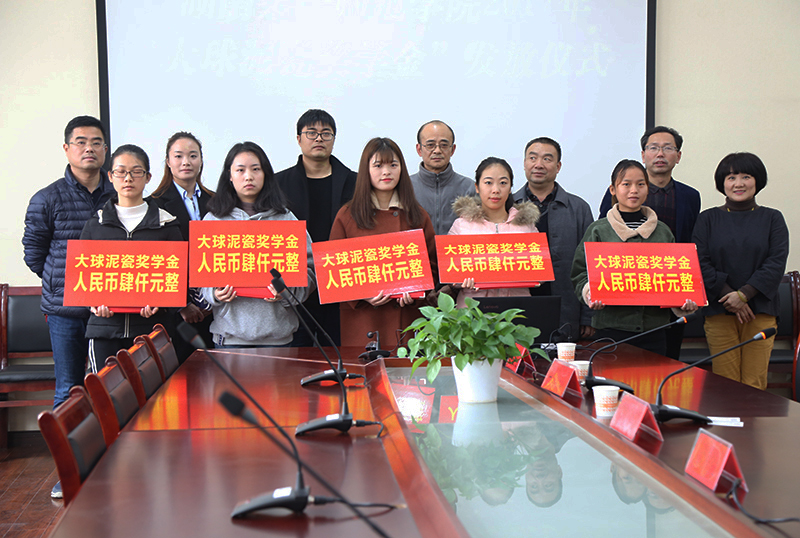 11月28日,大球泥瓷藝受邀參加湖南第一師范學院2017年“大球泥瓷獎學金”發放儀式,常務副總張萍、副總楊振偉出席了此次活動。