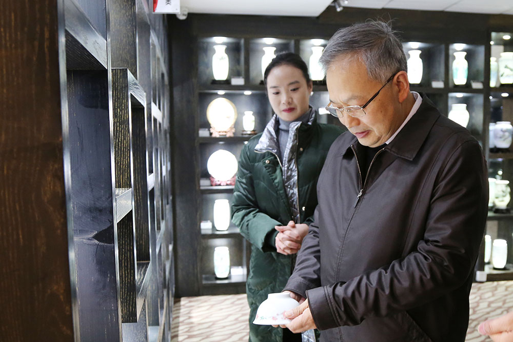 在滕召華董事長的陪同下,王主任一行參觀了大球泥瓷藝的企業(yè)文化展廳和經典作品展廳。常務副總張萍詳細介紹了公司核心競爭力——大球泥原料及研發(fā)歷程,公司團隊和企業(yè)文化,知識產權和設計理念,經典作品與產品系列。 王主任看到大球泥原料樣品時,提到大球泥原料那么稀缺應該可以人工合成,滕董解說道:七年前和工程院院士何繼善、邱冠中做個研討,這種原料是燕山時期巖漿侵入地表時逐步形成的,一是要有偉晶巖礦帶,二是要有地殼運動,三是要有風化條件。陶瓷是三元配方,人工合成泥料制作的瓷和大球泥原料制作的瓷會有本質區(qū)別,其溫潤通透用對比方法就顯而易見。 來到產品展示廳,看到眼前琳瑯滿目的作品后,王主任連連發(fā)問。 “瓷器越薄才會越通透,大球泥瓷這么厚也會有這么透亮嗎?” 滕董用手電在厚度超過1厘米的浮雕瓷盤底部打光,在燈光照射下,穿透出了瓷盤表面,泛出青潤的光暈。