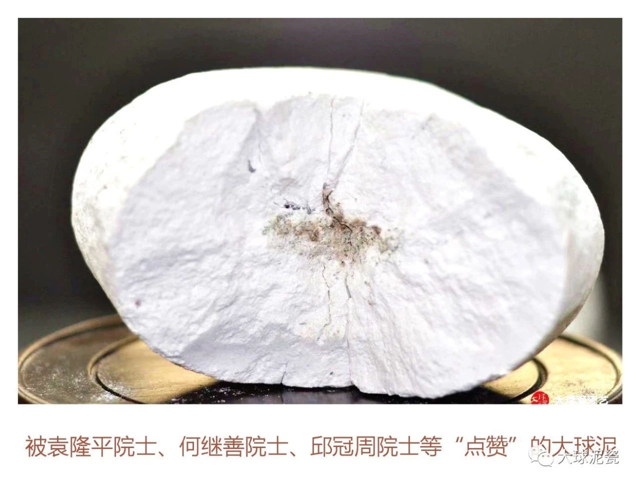 大球泥是偉晶巖風化物,雪白球狀體,形似恐龍蛋;含鋁量極高,含鐵量極少,是制作陶瓷的稀缺原料。至今世界只發現兩個礦源,一個是英國,二戰時枯竭;一個是湖南雪峰山,上世紀八十年代枯竭。現存于世就一百多 噸,絕大部分被大球泥瓷藝公司搶救性保護收藏,并審慎研究、開發、利用。