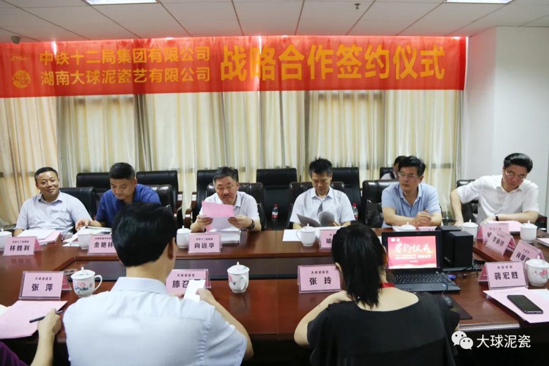 8月4日,中鐵十二局集團有限公司與湖南大球泥瓷藝有限公司戰略合作簽約儀式在長沙舉行。中鐵十二局集團副總經理向遠華,中鐵建華中區域總部湖南指揮長金艷林,中鐵十二局華東工程指揮部副指揮長林勝利,大球泥瓷藝董事長滕召華、常務副總張萍、副總經理姚衛等人參加。省文化和旅游廳二級巡視員喻樹長,省工商聯二級巡視員劉建平,長沙市委宣傳部常務副部長楊長江,天心區區委常委、宣傳部部長肖雄偉等領導出席。